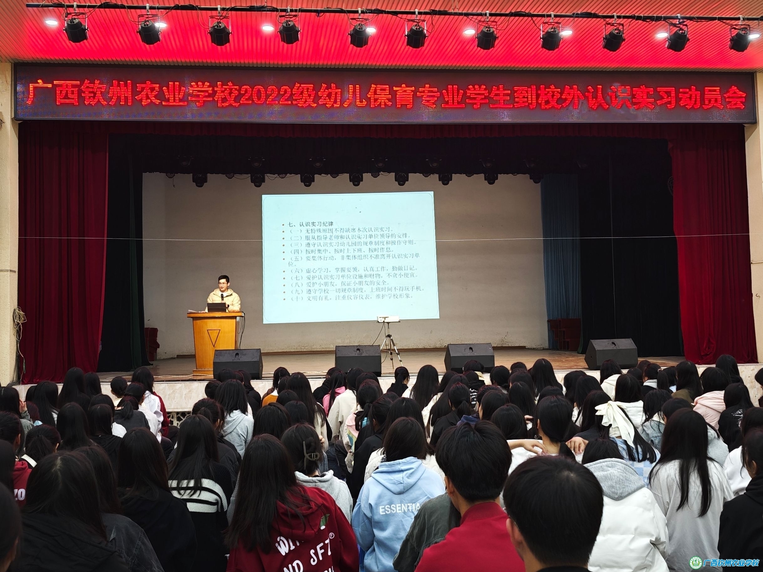 “致知在格物,物格而后知至。”为了能让2022级幼儿保育专业的学生观察、学习本专业的技能知识,能更早、更真实的了解岗位需求,商贸管理教学部组织学生走进幼儿园进行为期两周的认识实习活动。2023年11月15日晚,黎燕主任和梁俊老师在大礼堂组织召开幼儿园认识实习动员会,所有参加实习的学生、幼儿保育专业的老师、以及幼儿保育专业22级班主任参加了本次动员会。