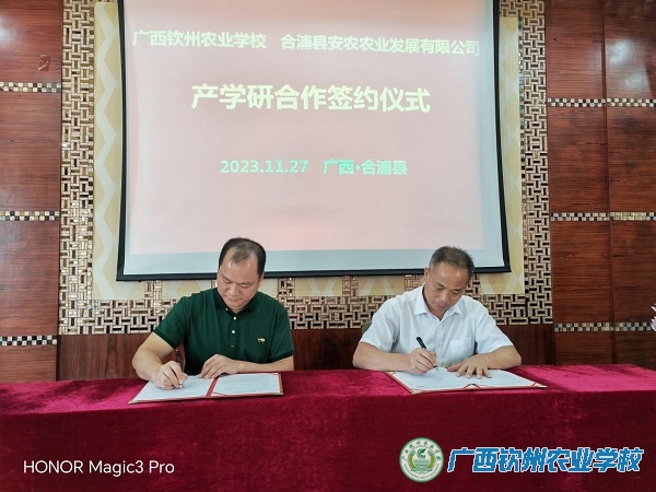 2023年11月27日(周一),融融冬日照乡野,悠悠白云挂蓝天,又是一个风和日丽出行的好日子。在伍国樑校长的带领下,我校郑修营主任等老师一行四人,驱车北海合浦,前往合浦县安农农业发展有限公司,与该公司签订产学研合作协议,双方正式挂牌落实共建教学实训见习基地,随后还分别对合浦的部分优秀校友进行了访谈,就有关学校的教学基地建设、办学发展、学生创业等问题进行了有益交流探讨。