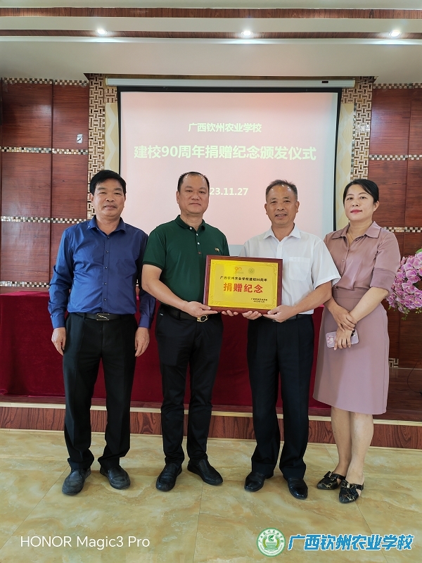 图三 伍国樑校长(右二)给庞乃雄总经理(右三)母校90周年校庆捐赠授匾
