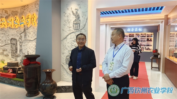 钦州市侨联黄永忠副主席(左一)一行在伍国樑校长(右一)的陪同下参观校史馆