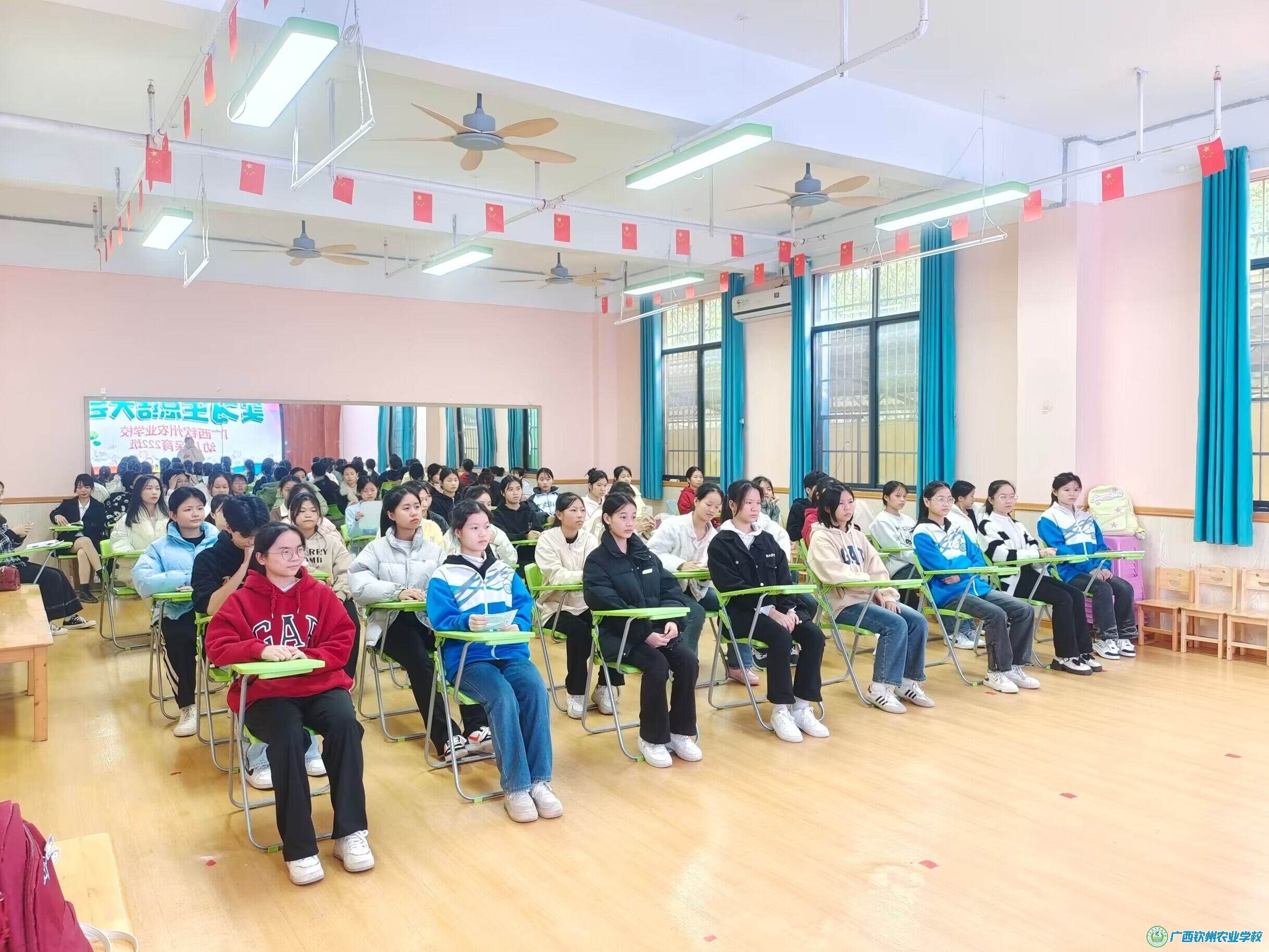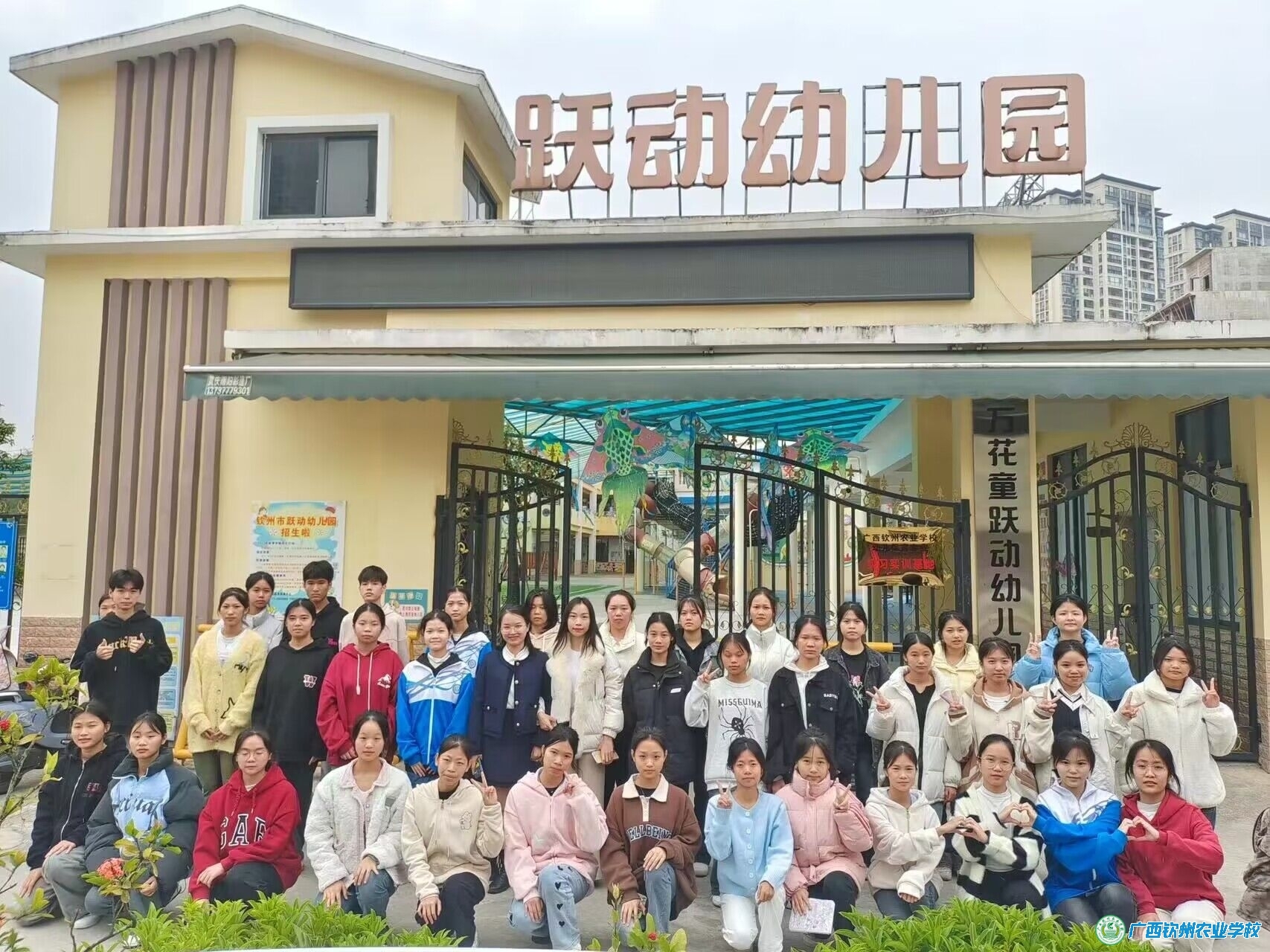 11月20日上午,天气晴朗。我校幼儿保育专业222班37名同学怀着喜悦的心情来到钦北区跃动幼儿园进行两个星期的见习实训活动。带队老师是班级班主任宁少玲。 刚踏入园区,印面而来的是和蔼热情的林园长,她带领学生们到舞蹈室进行见面会。会上,林园长首先代表幼儿园对同学们到来表示最诚挚的欢迎。随后,林园长向学生们详细介绍了幼儿园的基本情况及分班安排。