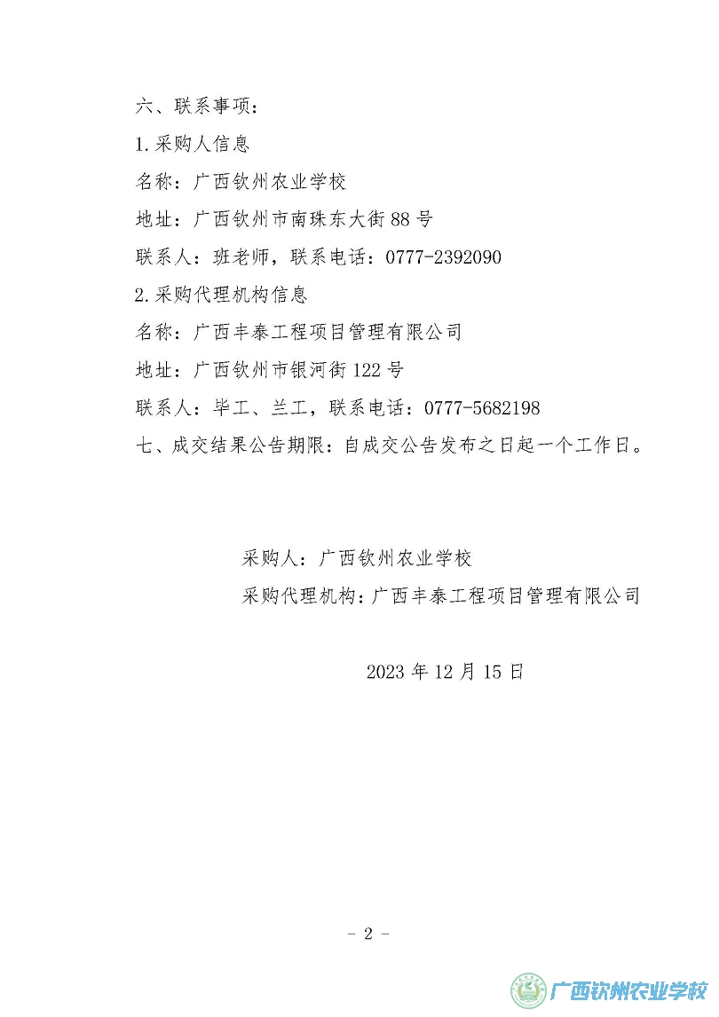 广西丰泰工程项目管理有限公司 广西钦州农业学校实训综合楼项目工程监理(GXFTD3C2023007)成交结果公告