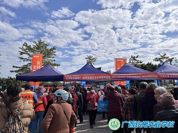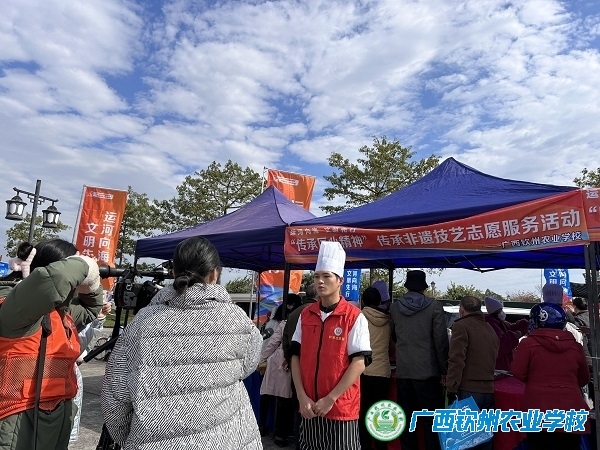 12月20日上午10:00,由学校党办和团委组织,现代农业学部的王宇桦、黄仪群、黄昌帅、王英胆、钟志军等老师带领烹饪专业和面点专业的学生组成的志愿者服务队到钦南区三宣堂社区永福广场参加钦州市“运河向海 文明先行”主题活动。活动由市委宣传部、市委网信办、市文明办、市融媒体中心、广西平陆运河工程建设指挥部、市文化广电体育旅游局等单位联合举办。