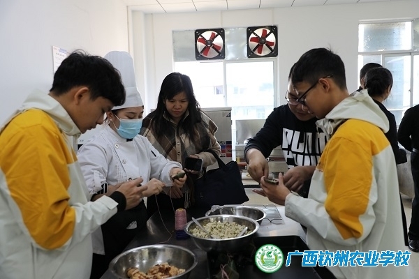 在学校领导的陪同下,马来西亚华裔青少年“运河向海”钦州营一行参观了昆虫标本馆、水产标本馆、校史馆、农史馆、心理咨询室、面点实训室。在食堂四楼,冬令营营员们参加了包粽子活动。我校面点专业老师和同学们特地准备了上好的绿豆糯米、五花肉、粽叶等食材,一折叶、二盛料、三压实、四包紧、五扎绳,现场耐心指导华裔青少年朋友们如何包粽子,还向他们讲解了粽子的来历。亲身的实践体验和包粽子的乐趣,让营员们更深切地感受到中华优秀传统文化的不凡。