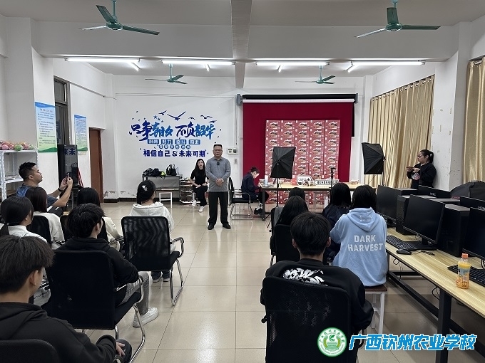 1月9日,我校携手广西利佰兴食品集团有限公司、探钦州团队,在学校第二实训楼电商视觉设计实训室开展直播电商培训及直播实操展示,在商贸学部关君老师的组织下,我校电商专业2022级,2023级共40余名学生报名参加培训及观摩直播。