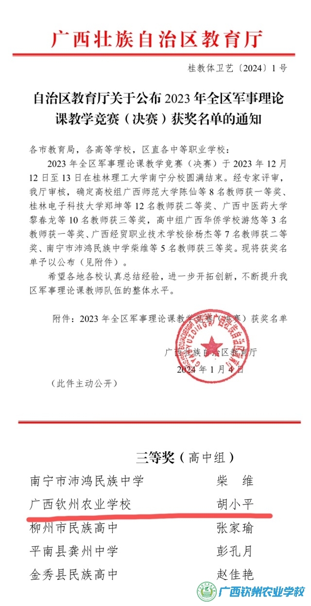 近日,《自治区教育厅关于公布 2023 年全区军事理论课教学竞赛(决赛)获奖名单的通知》发布,我校党员教师胡小平获2023 全区军事理论课教学竞赛(高中组)三等奖。