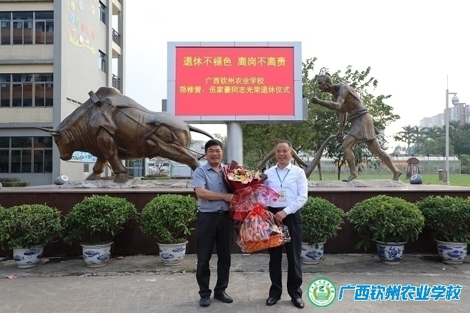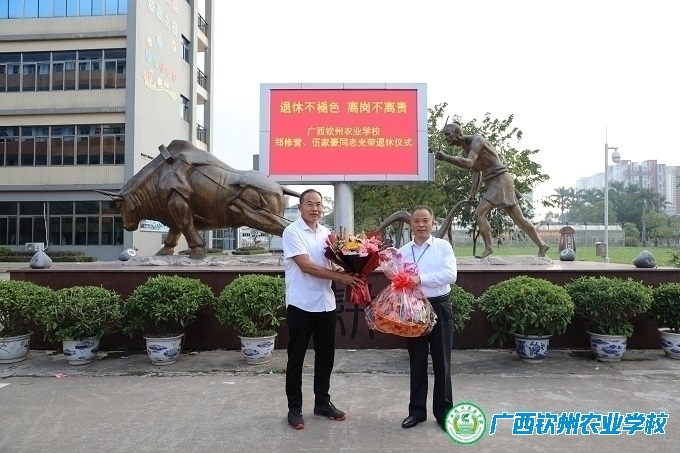 图为学校党委书记、校长伍国樑为郑修营老师送上鲜花、果篮