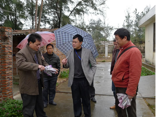 广西水产研究所海水养殖中试基地谢场长(左一)向覃副校长介绍良种场的基本情况