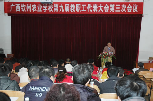 大会期间,代表们严格履行了自己的职责,表现了高度责任感和使命感,以主人翁的精神,认真听取并审议了主持学校工作的副校长伍国樑同志作的《2011年学校工作总结和2012年工作计划》、覃一静副校长作的《2011年学校经费决算和2012年学校经费预算》等报告;认真讨论了《广西钦州农业学校2012年招生工作方案》和《80周年校庆筹备工作启动方案》等七个个议题,通过了广西钦州农业学校第九届教代会第三次会议决议。