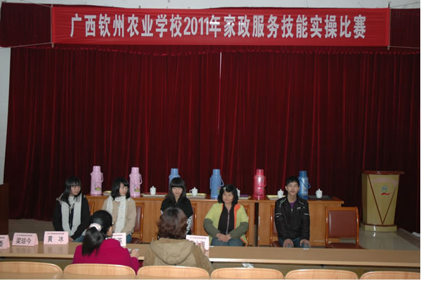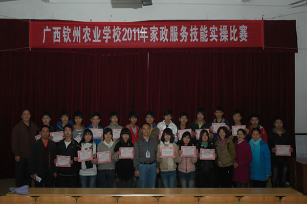第一期家政服务培训班开班典礼会场伍国樑副校长、覃一静副校长、覃效敏副校长、梁锶文主任、王岸红科长、曾启琴部长等领导在主席台就座伍国樑副校长在开班典礼上讲话钦州市商务局梁锶文主任在开班典礼上讲话开班典礼会场一角礼仪培训家用电器使用培训家庭烹饪培训家庭清洁培训家用电器使用技能考核礼仪技能考核家庭护理技能考核技能实操竞赛(礼仪)伍国樑副校长为获竞赛一等奖的学员颁奖学校领导、老师与家政服务技能实操竞赛获奖的学员合影