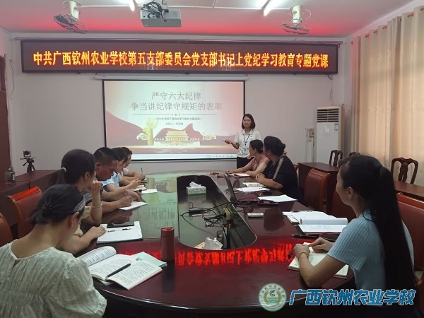 为深入学习领会习近平总书记关于全面加强党的纪律建设重要论述,引导党员同志学纪、知纪、明纪、守纪,推动党纪学习教育走深走实,以更严明的纪律、更务实的作风提升工作能力和工作质量,7月1日下午,我校第五党支部书记劳海燕在第一会议室为全体党员讲授党纪学习教育专题党课。支部全体党员、预备党员参会聆听。