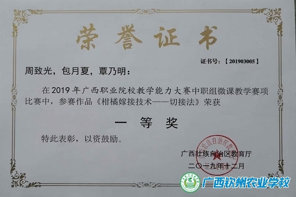 教师参加全区中职校教师职业技能竞赛、全区中等职业学校班主任基本功大赛、全区文化课教学技能大赛、广西职业院校信息化大赛、广西职业院校教师教学技能微课比赛、第五届全国涉农职业院校教师教学能力大赛等,获得多项奖励。学生参加全国、全区职业院校技能大赛取得优异成绩,在全国职业院校技能大赛中,实现了零的突破,获得一个二等奖、两个三等奖。