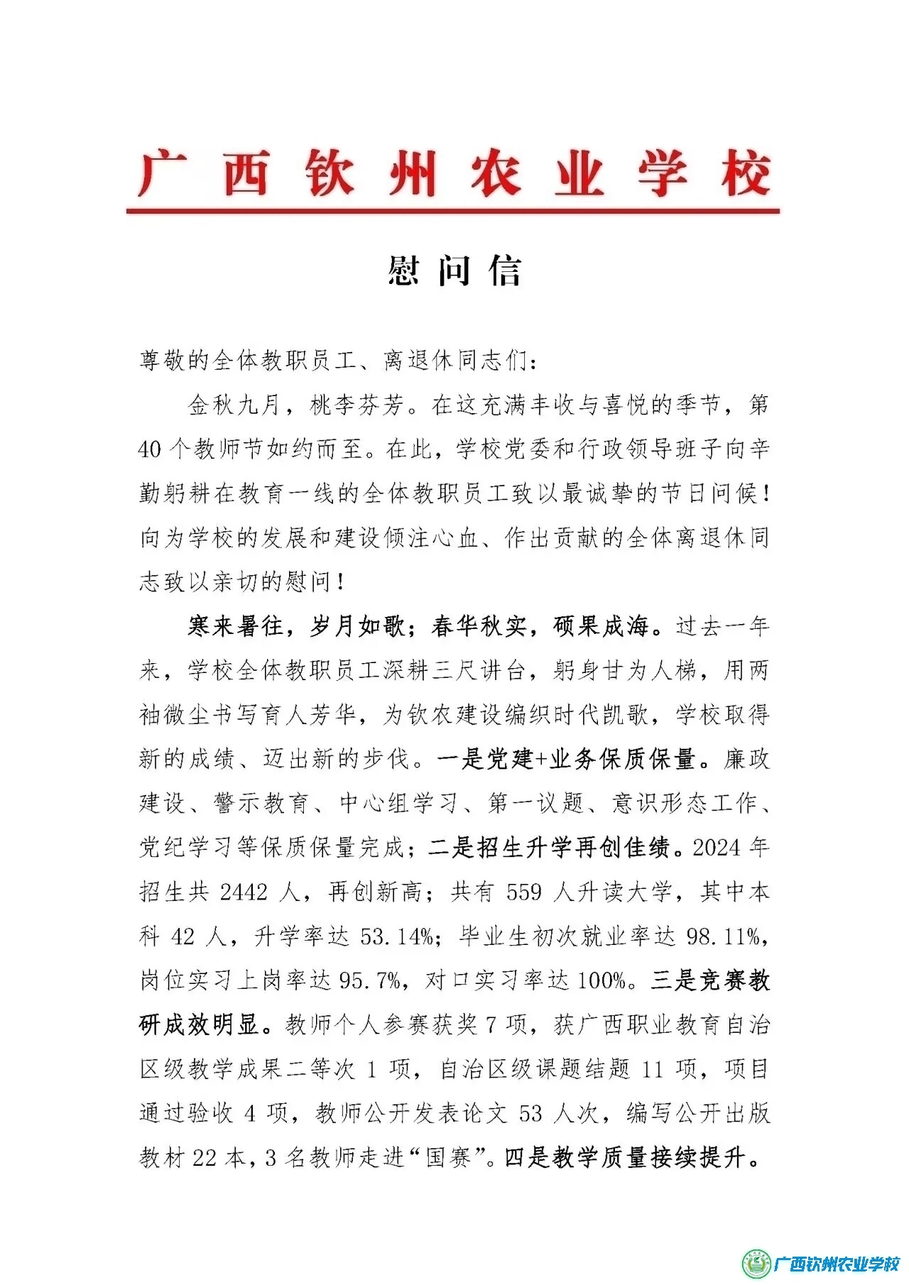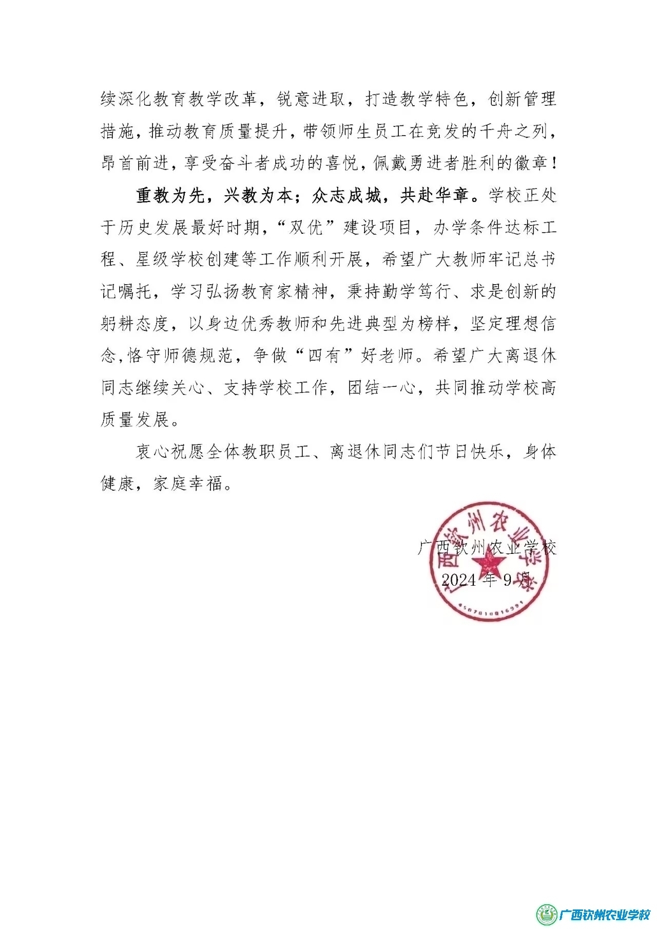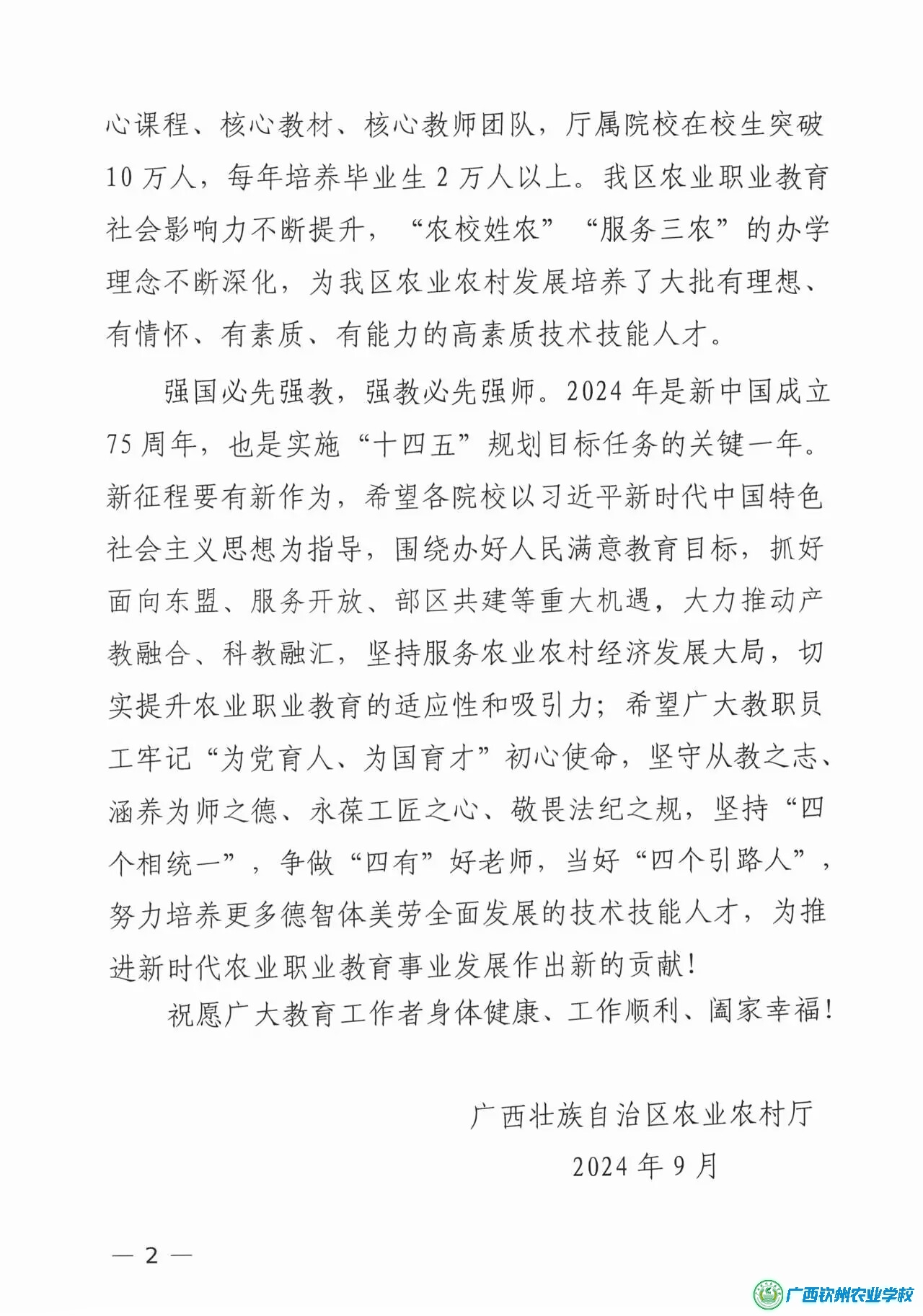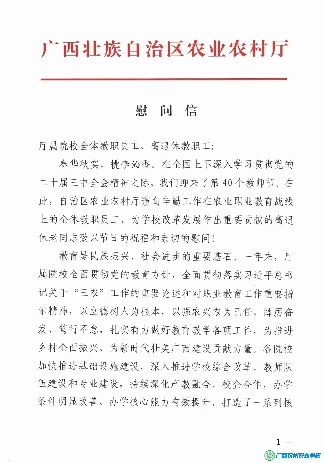 广西壮族自治区农业农村厅、广西钦州农业学校教师节慰问信