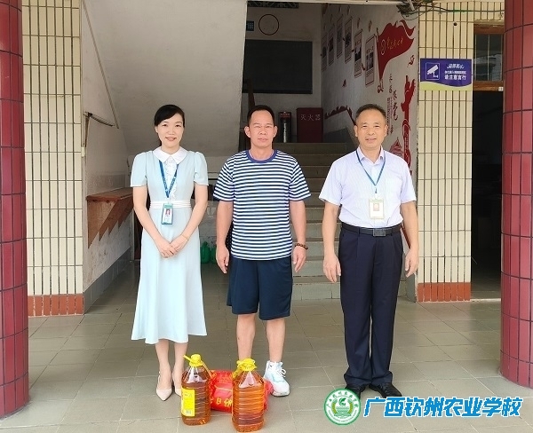 伍国樑校长(右)、曾珊主任(左)与驻村工作队员陈志曹(中)进行慰问留影