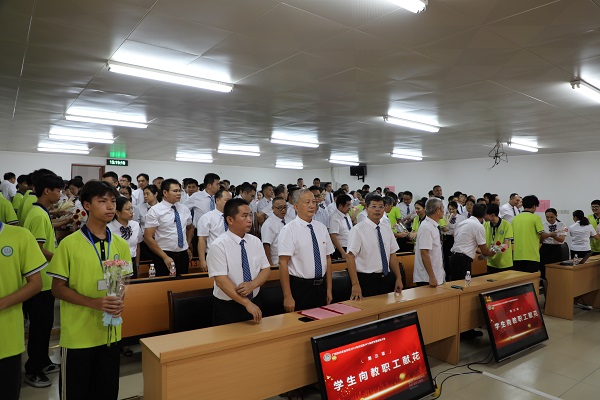 在庄重而热烈的庆祝教师节大会上,学生们为每位到场的老师精心准备了鲜花。当大会进行到献花环节时,学生们满怀敬意地走上台前,将手中的鲜花和深情的祝福献给老师。老师们接过鲜花,脸上洋溢着幸福的笑容,现场掌声雷动,气氛温馨而感人。
