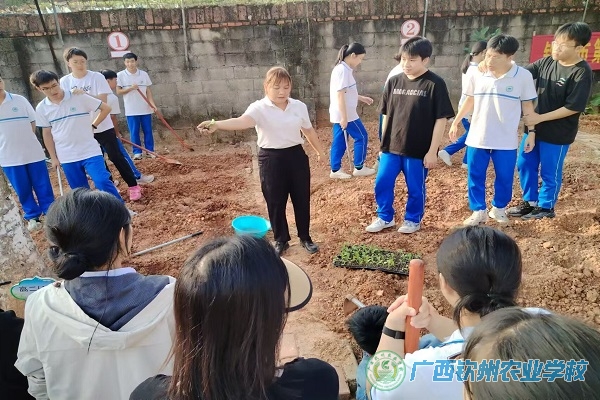 11月6日下午4点,我校现代农业学部梁秀芳老师应邀前往钦州市第一中学进行劳动教育实践授课,钦州市第一中学高二年级28个班参加此次劳动教育实践课活动,市一中李之升主任、吴小明老师陪同指导。同学们在梁老师的精心指导下,规范使用劳动工具,掌握了劳作技巧,进行了整地、起垄、栽种等种植环节,种植了菜心、芥兰、生菜、芥菜、葱、蒜六种应季蔬菜,共计1240株菜苗。通过此次活动,同学们既体会农民的耕耘辛苦,又激起学生的劳动热情,在劳作中增强学生劳动意识,寓教于乐。
