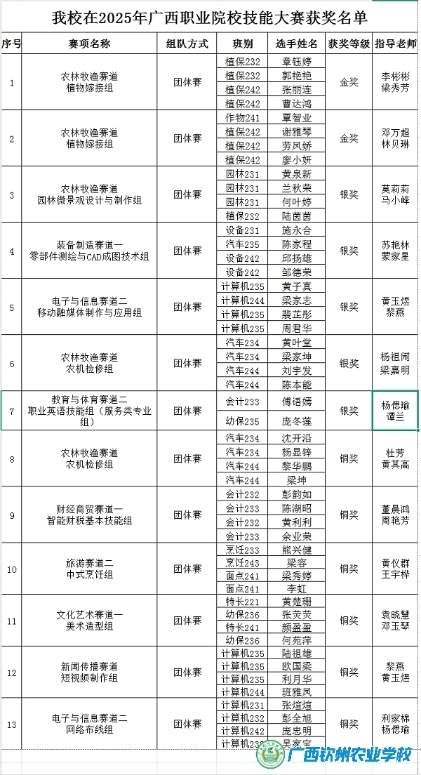 近日,广西壮族自治区教育厅公布了2025年广西职业院校技能大赛获奖名单,我校学子在比赛中发扬奋勇拼博、沉着应对、不畏强手、争取第一的精神,展现了良好的专业技能水平,最终取得金奖2项、银奖5项、铜奖6项的优异成绩,书写了“青春由磨砺而出彩,人生因奋斗而升华”灿烂篇章。