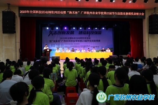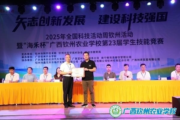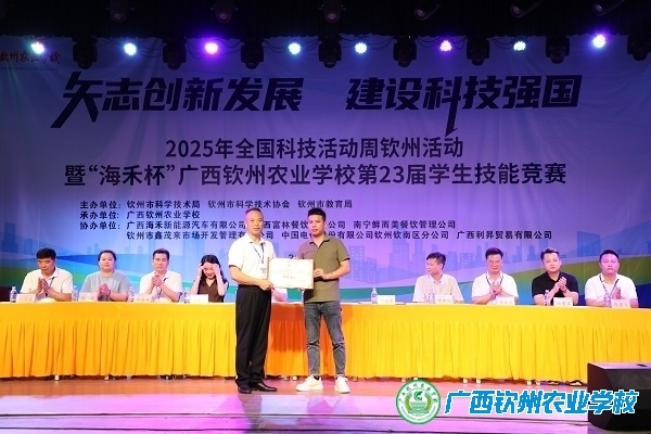 5月20日下午,我校在大礼堂举行2025年全国科技活动周钦州活动暨“海禾杯”第23届学生技能竞赛颁奖仪式。党委书记伍国樑、校长梁文宇,副校长李运光、邓业斌等领导班子成员和广州海禾新能源汽车有限公司经理苏波庆、广西富林餐饮服务有限公司总经理傅世彬、南宁鲜而美餐饮管理有限公司经理兰曾艳、钦州市鑫茂来市场开发管理有限公司经理陆重霖、广西利昇贸易有限公司经理利冰等特邀嘉宾到场与获奖师生共享荣耀与喜悦。本次颁奖仪式由教务科副科长李彬彬主持。