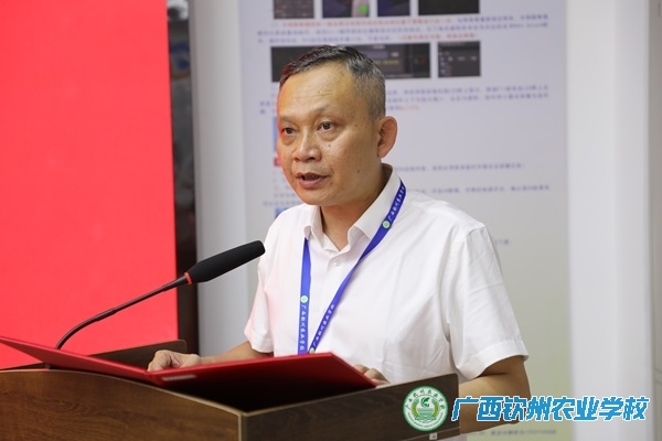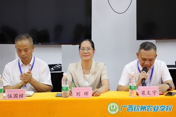 介绍交流:钦州市侨联党组书记刘晖(中),广西钦州农业学校党委书记伍国樑(左)、校长梁文宇(右)