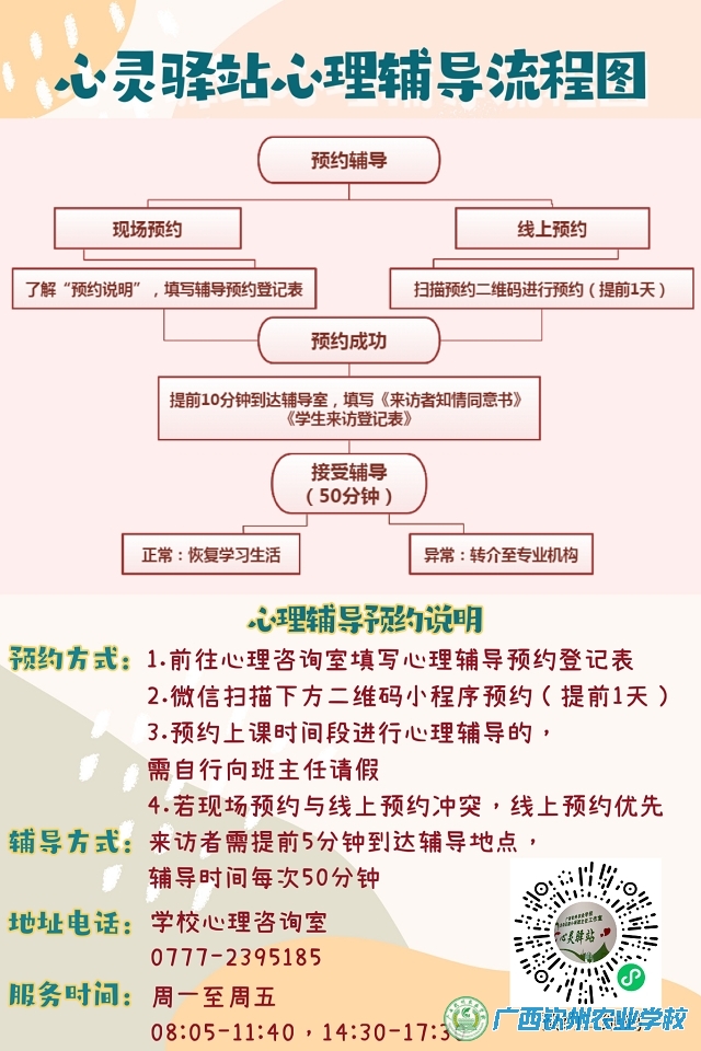 盛夏渐远,金秋已至。欢迎各位新同学加入广西钦州农业学校这个温暖的大家庭,也欢迎老同学们重返生机勃勃的校园!从悠闲的假期模式切换到紧张的学习节奏,无论是谁,都需要一个适应的过程。为了帮助大家更好地调整心态,以积极、乐观、饱满的状态开启新学期,学校心理咨询室为大家准备了这份《开学心理健康指南》,希望能陪伴大家平稳、顺利地度过开学适应期。