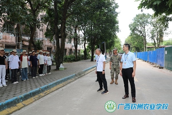 9月3日上午,我校校长梁文宇、副校长邓业斌,会同学生科科长陈贵才,前往学校大操场与校园内主干道,看望慰问正在开展军训的学生,钦州市钦南区人民武装部带队教官李中华全程陪同。