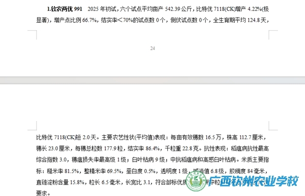根据农业农村部稻米及制品质量监督检测中心(杭州),广西农科院水稻所等权威部门数据分析,我校“钦农两优991” 2025年初试,在南宁、百色、合浦、贵港、玉林、藤县等六个试点平均亩产542.39公斤,米质符合部标优质一等食用中粒形籼稻品种品质规定要求,符合绿色品种标准,2025年广西水稻品种试验年会审议意见,建议进入2026年区试+生试。