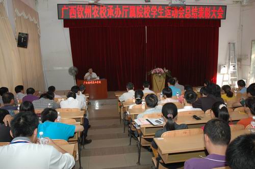 伍国樑校长在会上作了讲话,他高度肯定和评价我校承办农业厅直属院校第十二届学生运动成功经验,取得的成功以及全体教职工的辛勤付出,并激励全体教职工继续发扬运动会中所表现出来的团结拼搏、创先争优、勇夺第一的钦农精神,为明年举办学校80周年校庆活动积累经验,争取多出成绩。