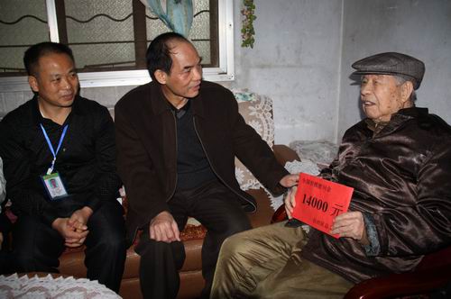 何大英(中)向老劳模吴恒舜(右)送慰问金