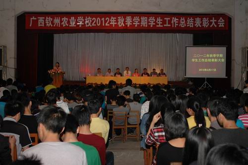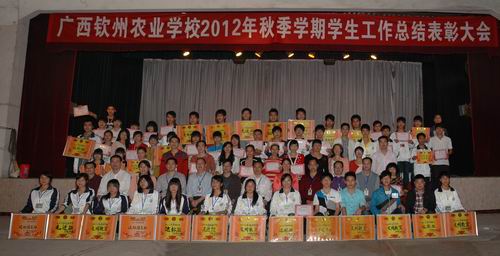 表彰大会现场学生科邓业斌科长宣读学校2012年秋季学期学生工作总结评优表彰决定伍国樑校长为先进班集体颁奖覃一静副校长在表彰大会作总结讲话优秀班主任代表冼锦胜老师作获奖感言优秀学生代表、学生会培养对象综合121班陆淑惠同学作获奖感言学校领导和颁奖嘉宾与领奖代表合影留念