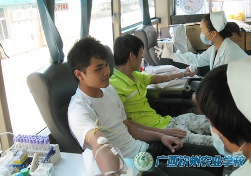 2013年5月11日上午,我校团委与钦州市无偿献血委员会联合在学校办公楼前开展校园师生无偿献血咨询及流动采血车采血活动,当天上午有28名年满18周岁符合献血条件的同学和许贵、花泽雄两位老师参加了无偿献血,他们领到了代表爱与奉献的公民无偿献血证,以实际行动为公益事业献出一份爱心。