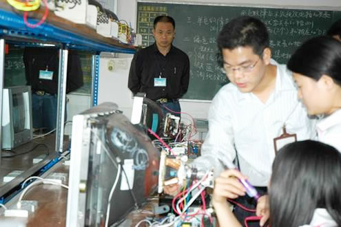 马老师授课内容是《彩色电视机》中的彩色故障现象与末级视放电路的关系,马老师利用15分钟来讲解理论知识,用15分钟的时间进行示范演示,最后让学生每2人一小组,通过观察、检测和分析,使学生在掌握末级视放电路造成的彩电偏色故障的检修方法。