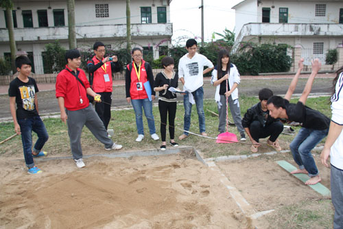 专家们对学生跳远项目进行复核